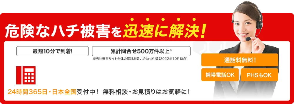 ハチ110番とは、ハチの駆除や蜂の巣の退治についてお悩みのお客様のための、WEB集客型蜂の巣駆除・ハチ駆除サービスです。 ハチ110番は多くの加盟店と提携しており、ご依頼の地域に最も早く対応できる蜂の巣駆除・ハチ駆除のプロのスタッフを派遣することができます。蜂の巣駆除・ハチ駆除のプロのスタッフは皆、確かな技術でお客様を悩ませるハチや巣をあっというまに駆除・退治できることはもちろん、親切・丁寧な対応でもお客様から多くのお喜びの声をいただいております。さらにハチ110番では、24時間365日、電話受付を対応いたしております。ハチが急に出現した時や、大きな蜂の巣を見つけた時、またお客様のお仕事がお忙しい時期でも、ご都合の良い時にいつでもお電話していただけます。