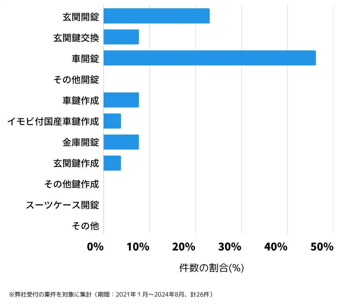 弊社にご依頼いただいた事例を分類してみると、車開錠が46.2%と圧倒的に多いことがわかりました。