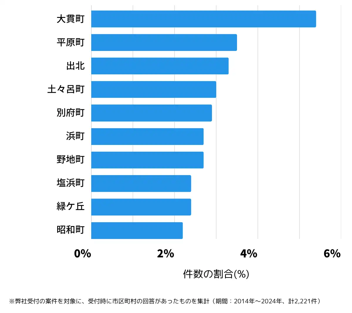 ※弊社受付の案件を対象に、受付時に市区町村の回答があったものを集計(期間:2014年~2024年、計2,221件)