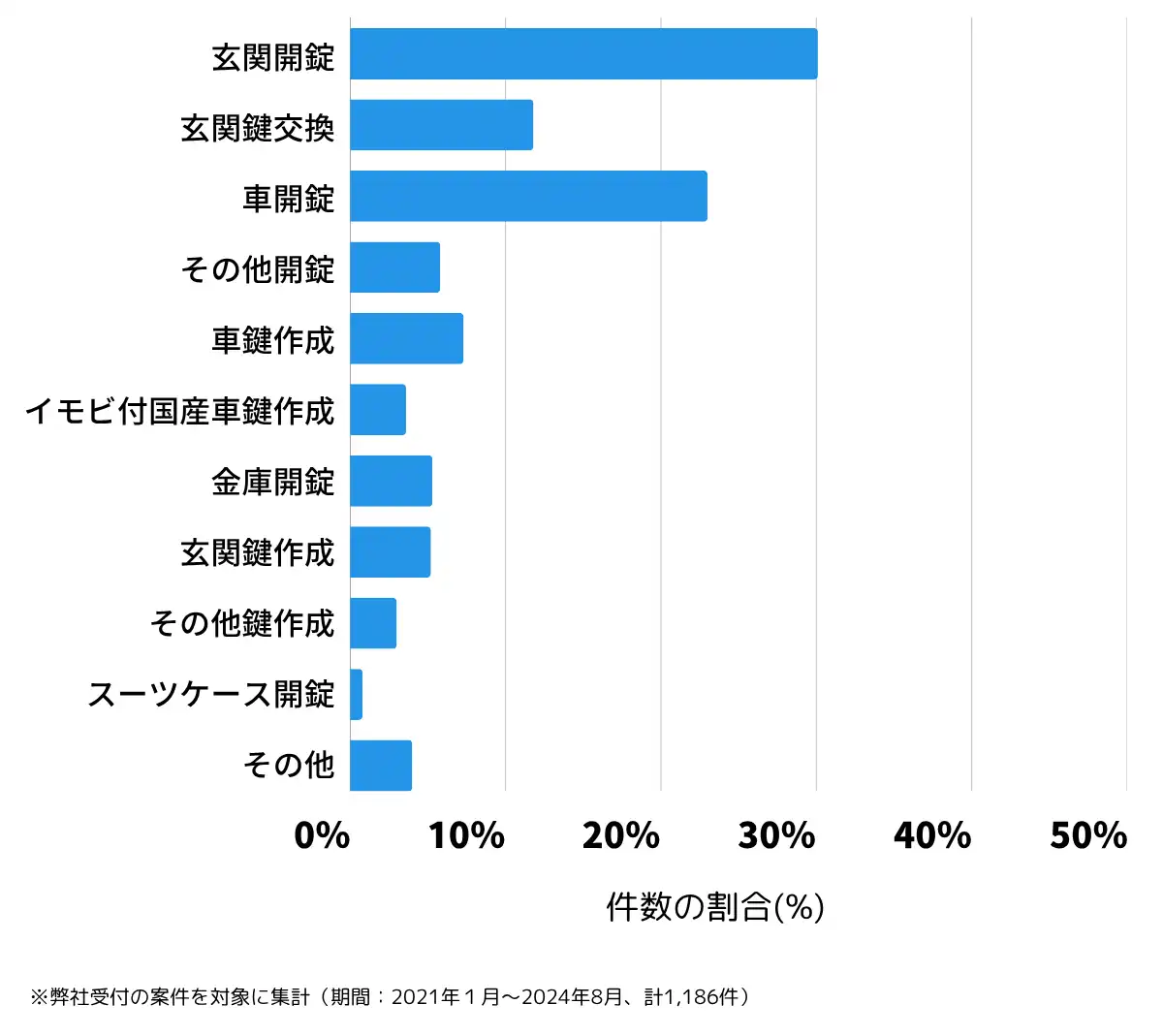 グラフを見ると、よくある依頼内容は「玄関開錠」の30.1%、「車開錠」の23.0%です。