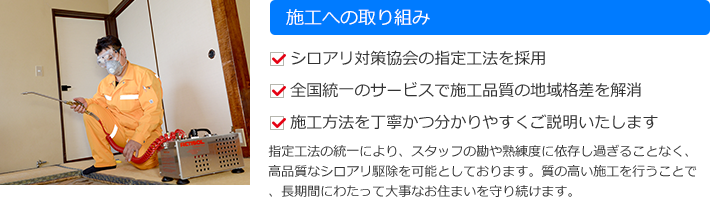 施工前の調査とお見積りは無料※1、お客様に満足して頂けるようしっかりと駆除を致します。 工法は社団法人日本しろあり対策協会が指定するものですので、駆除作業後の保証※2も付いていますので安心してご利用頂けます。