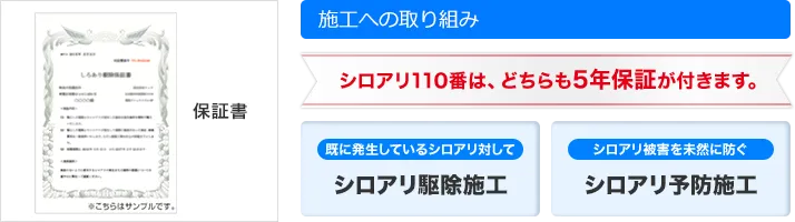 シロアリ110番では、施工後最長10年間の再発保証をご提供しております。5年間の保証が一般的な中でより長くご安心いただけます。
