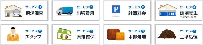施工前の調査とお見積りは無料※1、お客様に満足して頂けるようしっかりと駆除を致します。 工法は社団法人日本しろあり対策協会が指定するものですので、駆除作業後の保証※2も付いていますので安心してご利用頂けます。